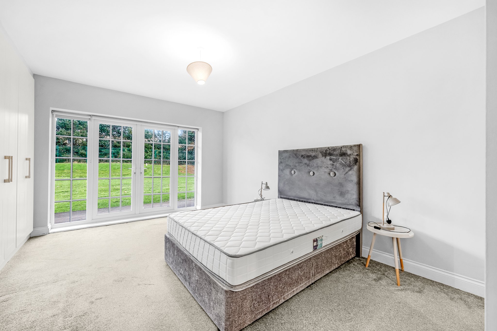 Laminate floor, large built-in wardrobe, ceiling light, French doors to terrace.