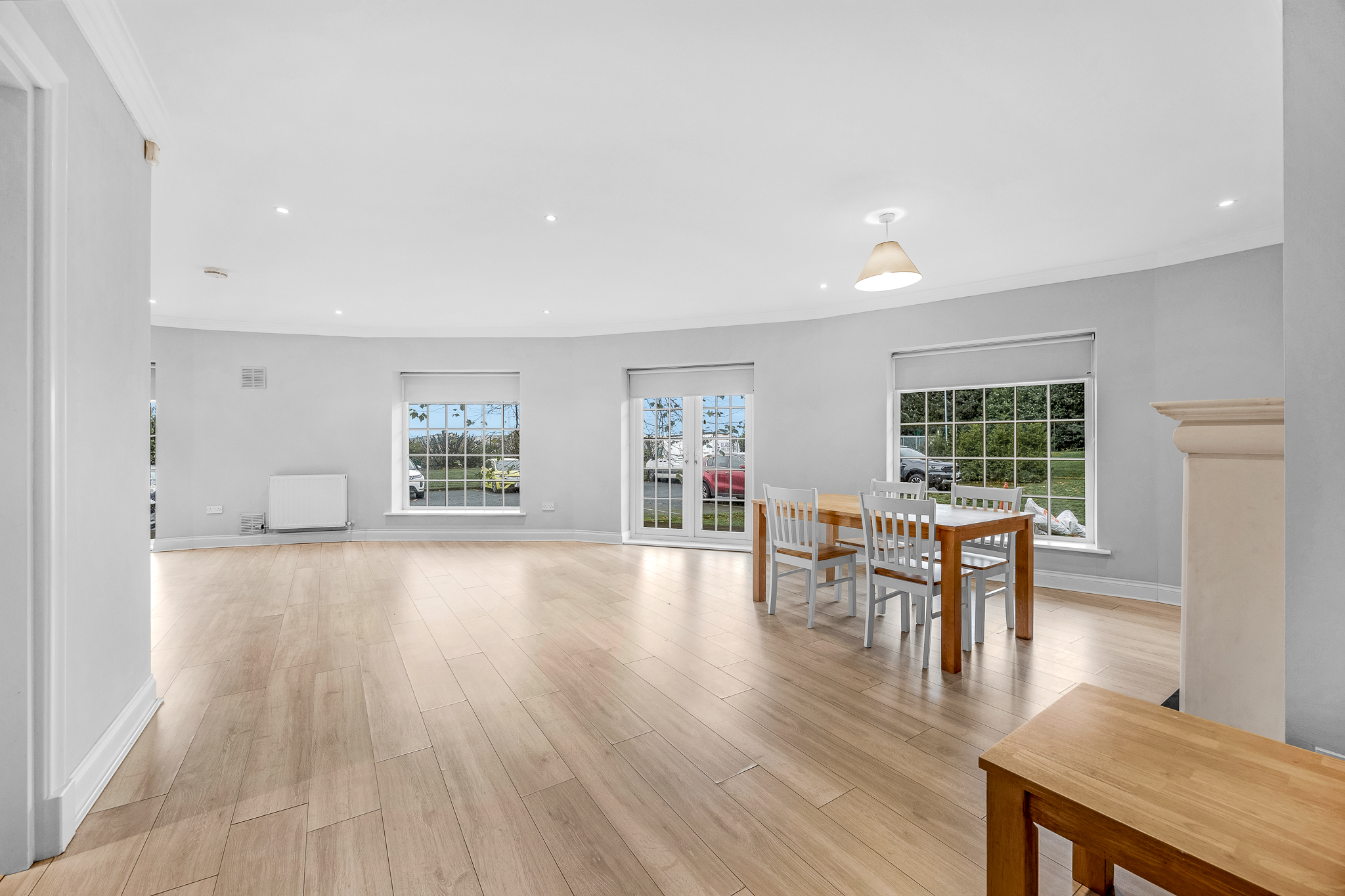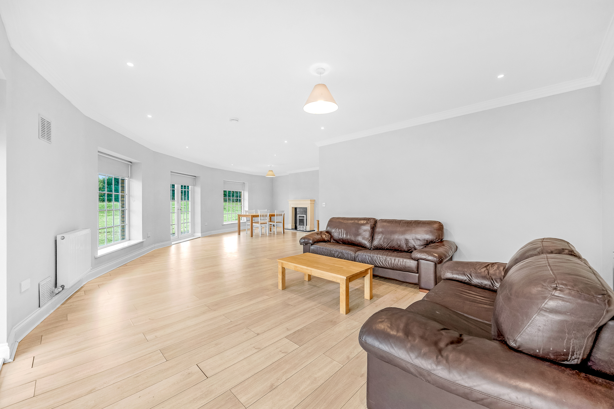 Laminate floor, recessed lighting, ceiling light, sandstone fire surround with granite hearth and insert and gas fire, French doors to terrace.