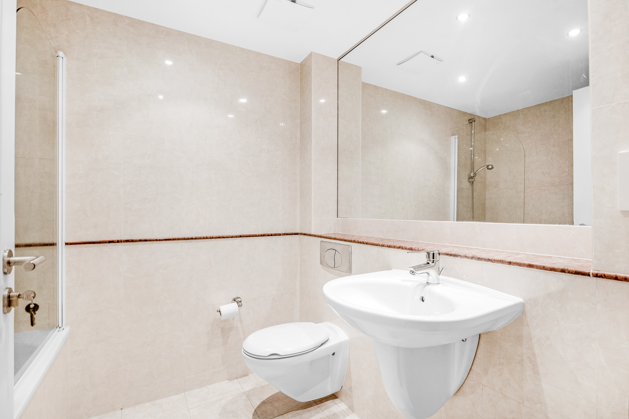 Tiled floor and walls, wall mounted sink, bath, bath screen, wall hung w.c, granite shelf, mirror, recessed lighting, extractor fan.