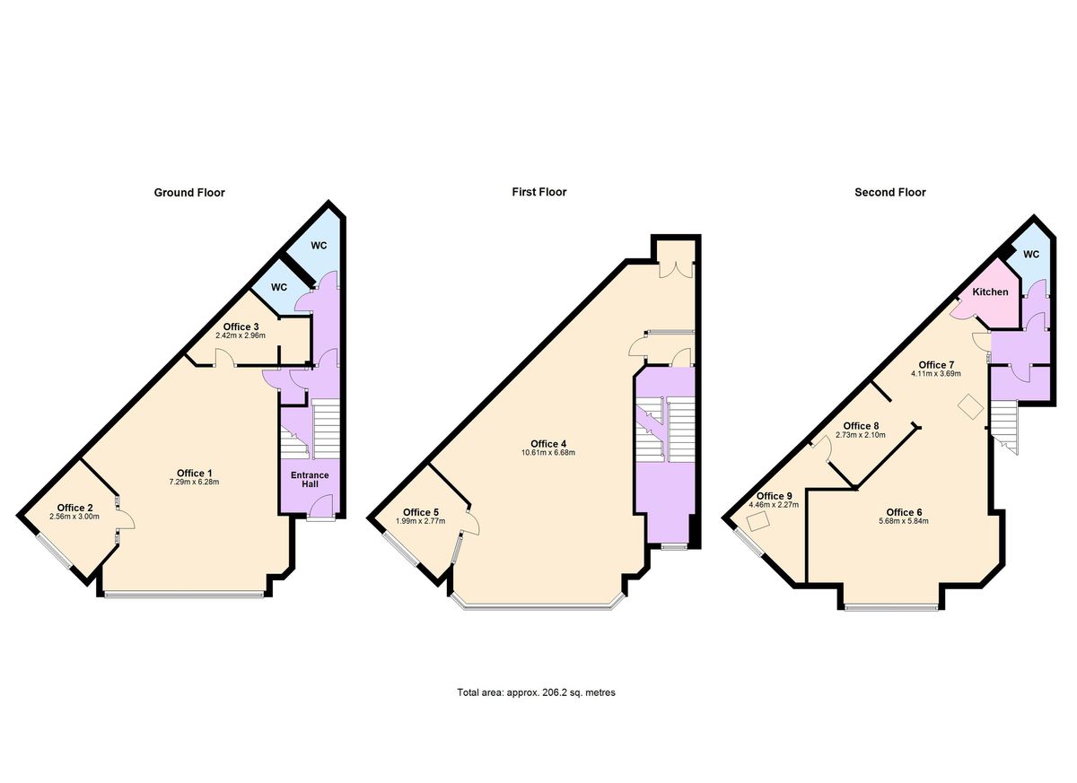 Predominantly open plan with partitioned separate offices on each floor, there are kitchenettes on all floors. There is in addition Ladies and Gents toilets on the ground floor and a further toilet on the second floor. Previously the ground floor was used as a pilates studio, the first floor an estate agency office and the top floor as an art school. Each floor can be accessed independently from the staircase and has its own electricity meter.