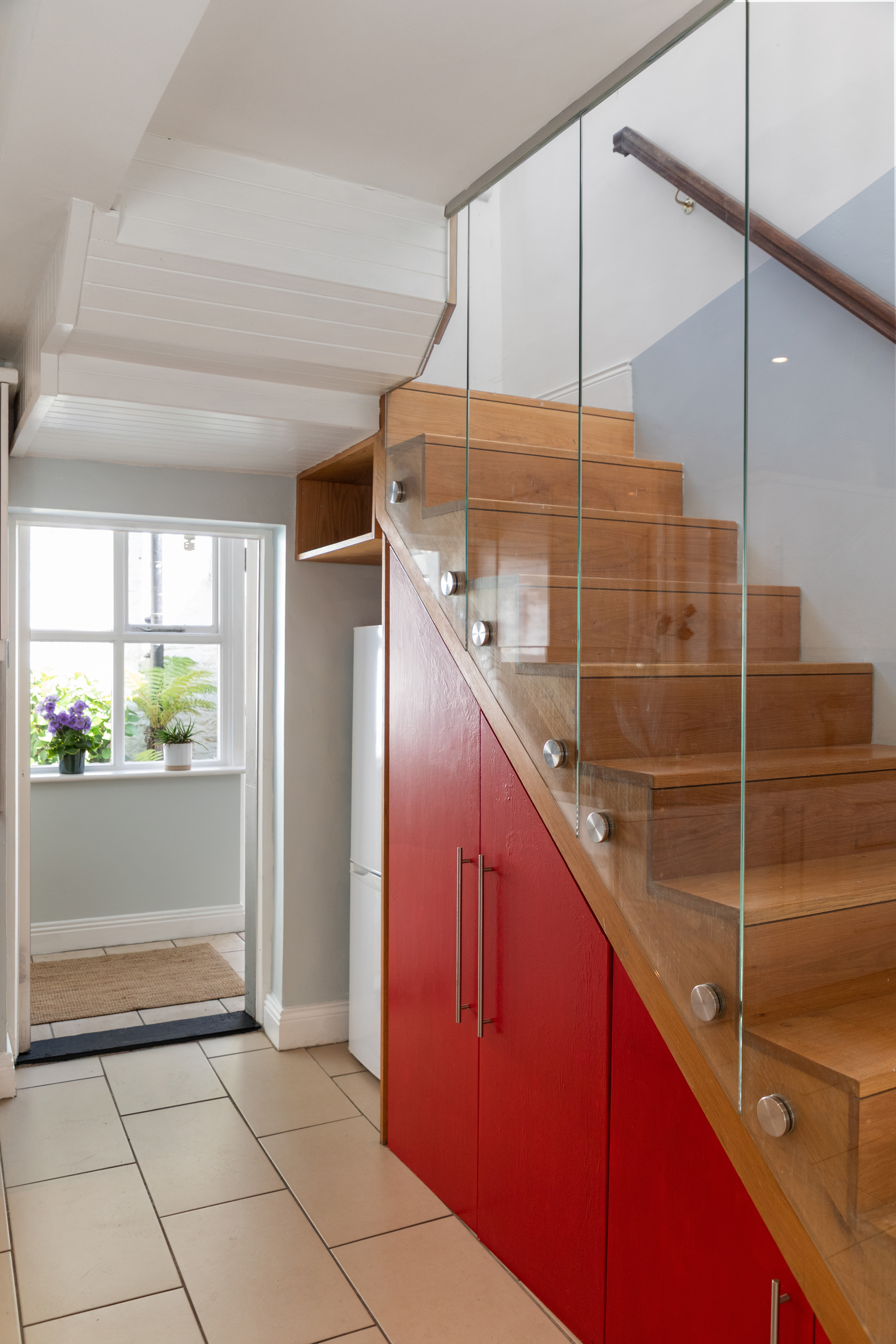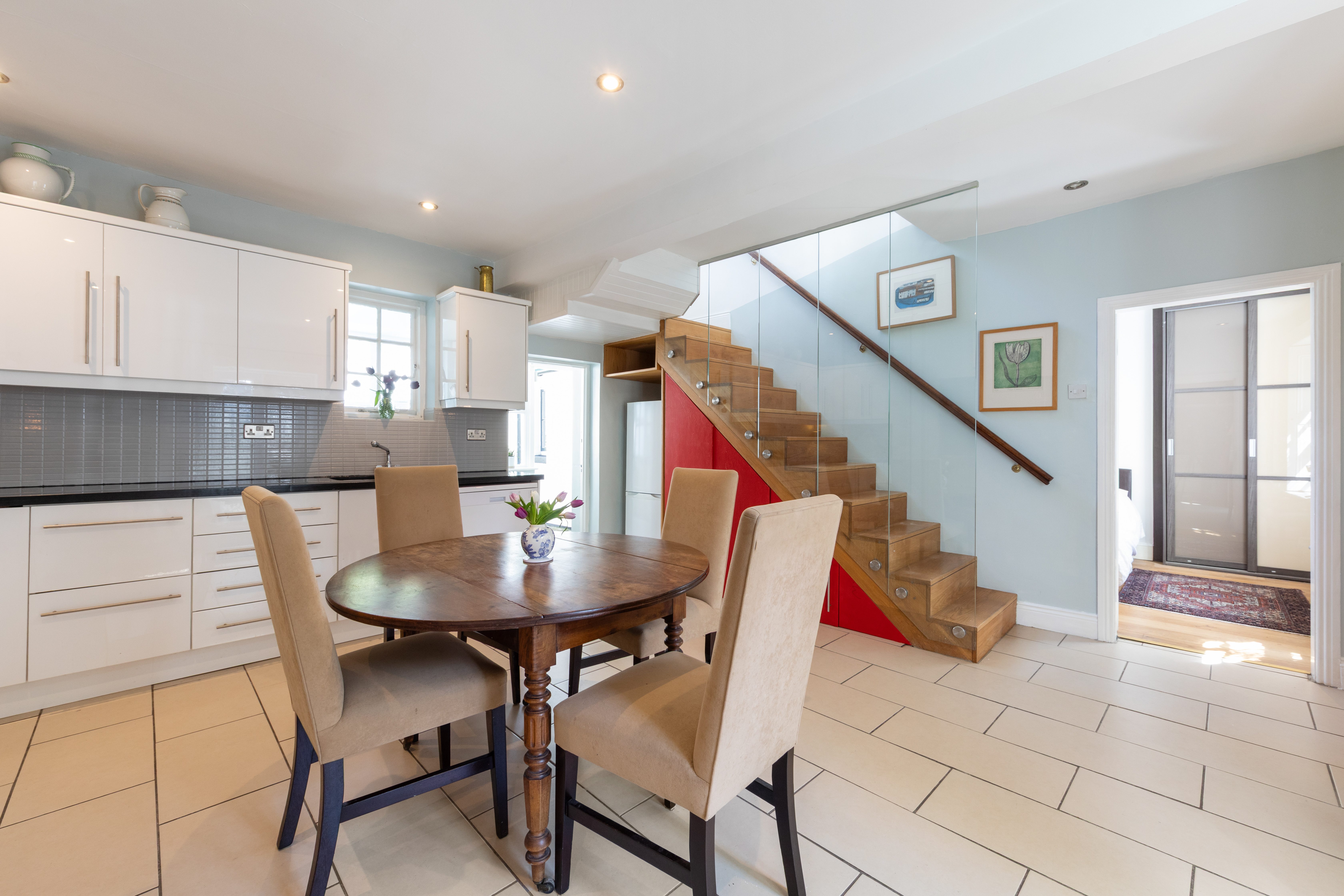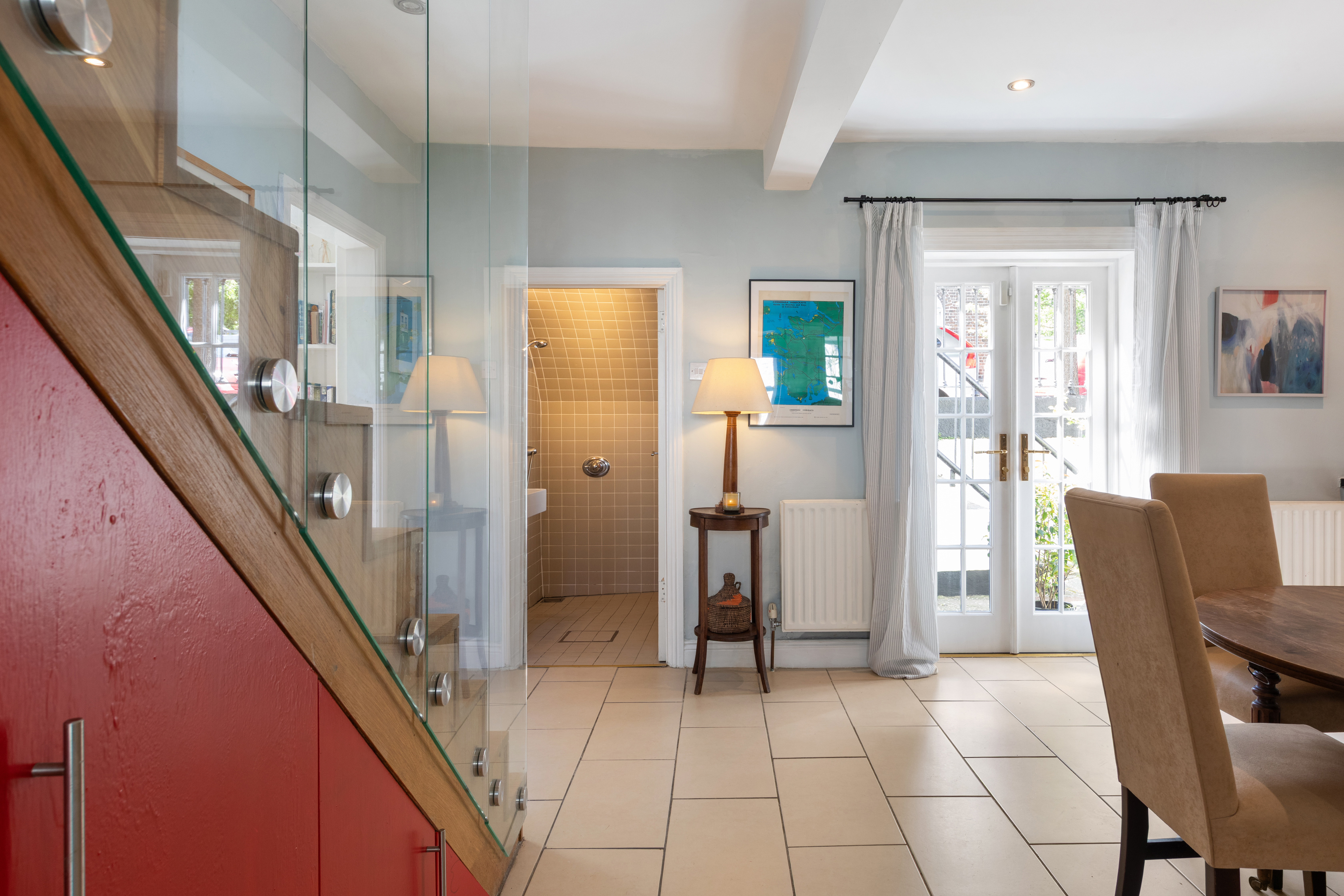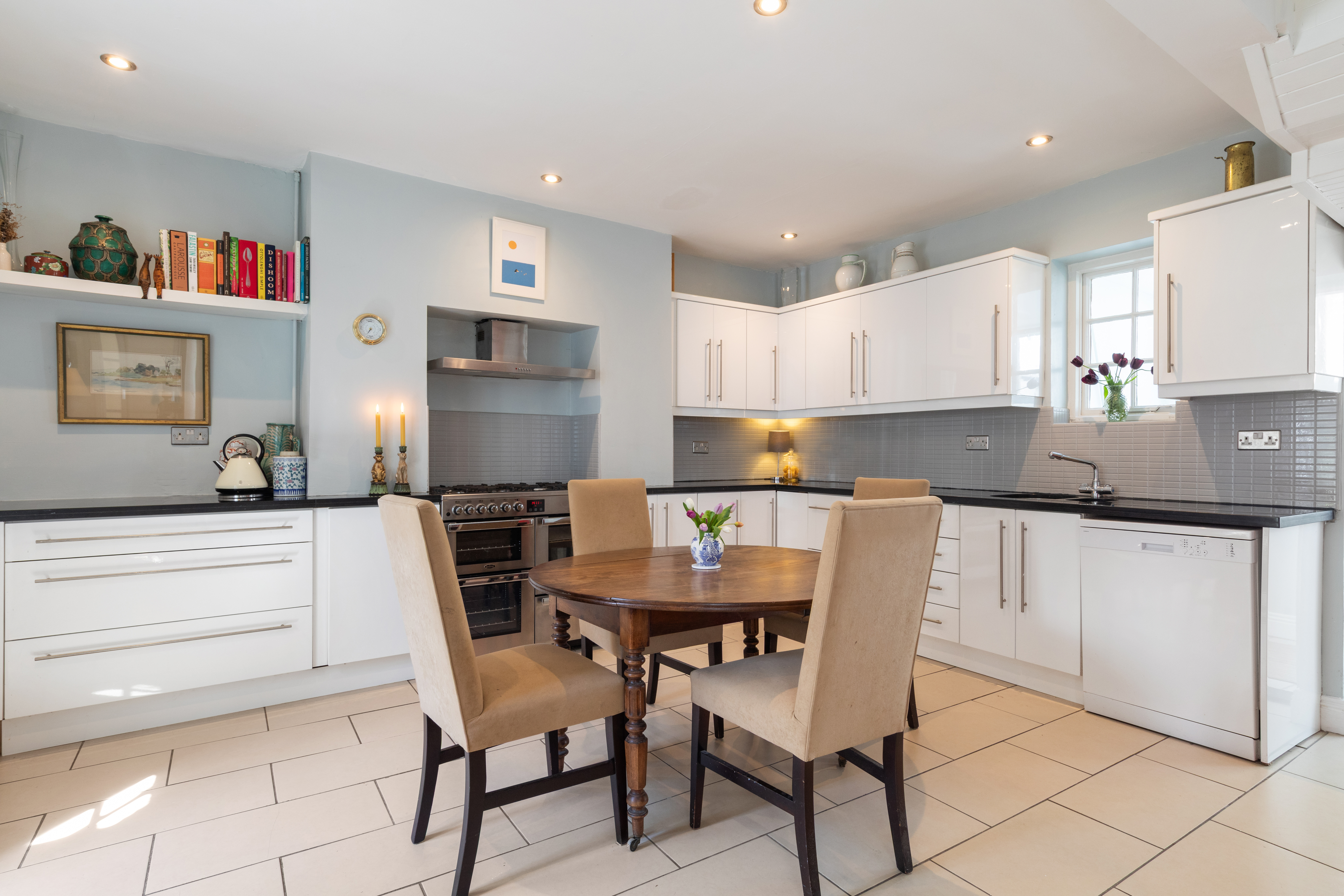 Tiled floor and splashback, built in high gloss white wall and floor units, undermounted double sink, recessed lighting. Belling 100cm fuel range cooker, brushed steel extractor fan, granite countertop, dishwasher, understairs storage, 50:50 fridge freezer, French doors to front courtyard terrace with steps to gate, feature oak and glass staircase,
