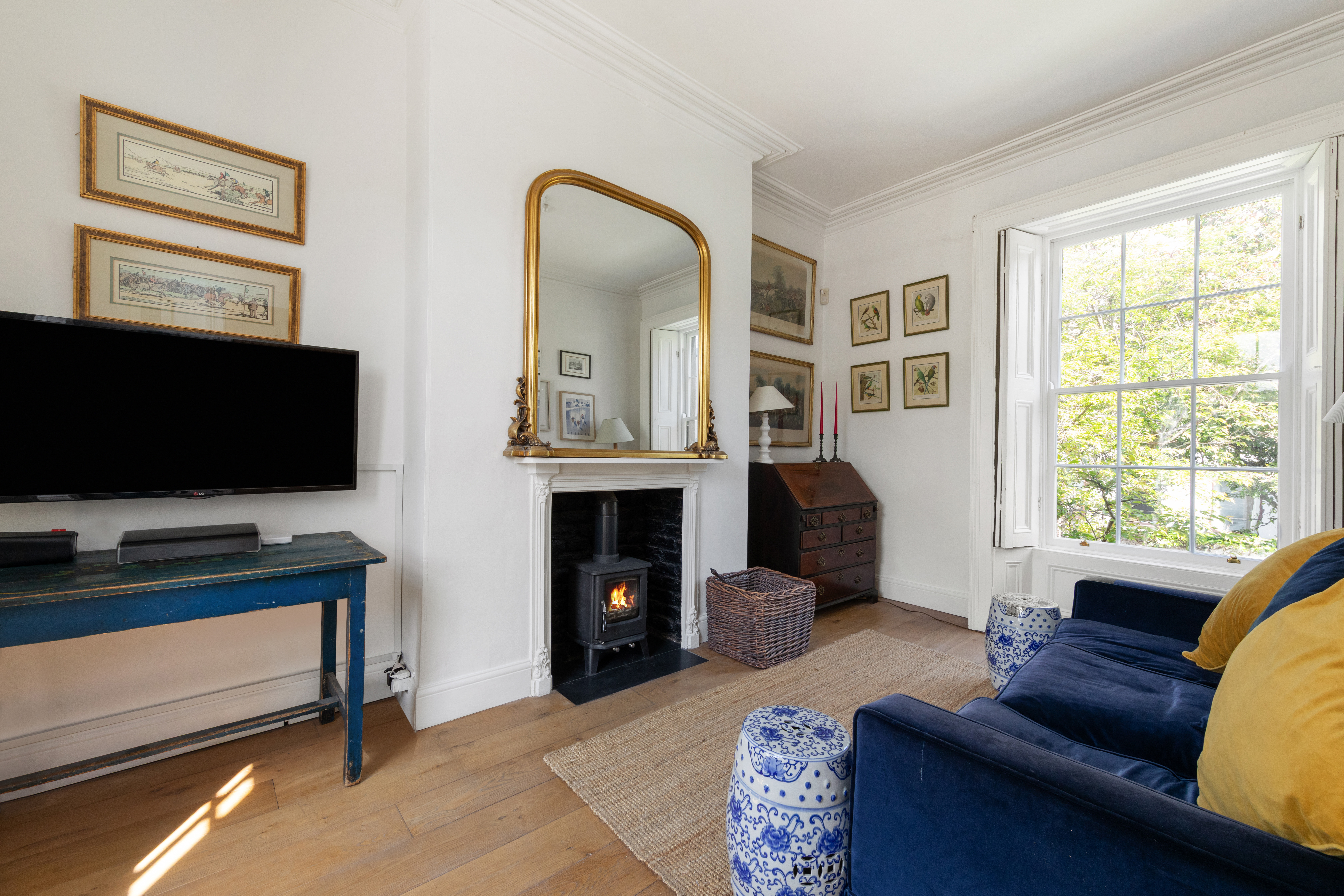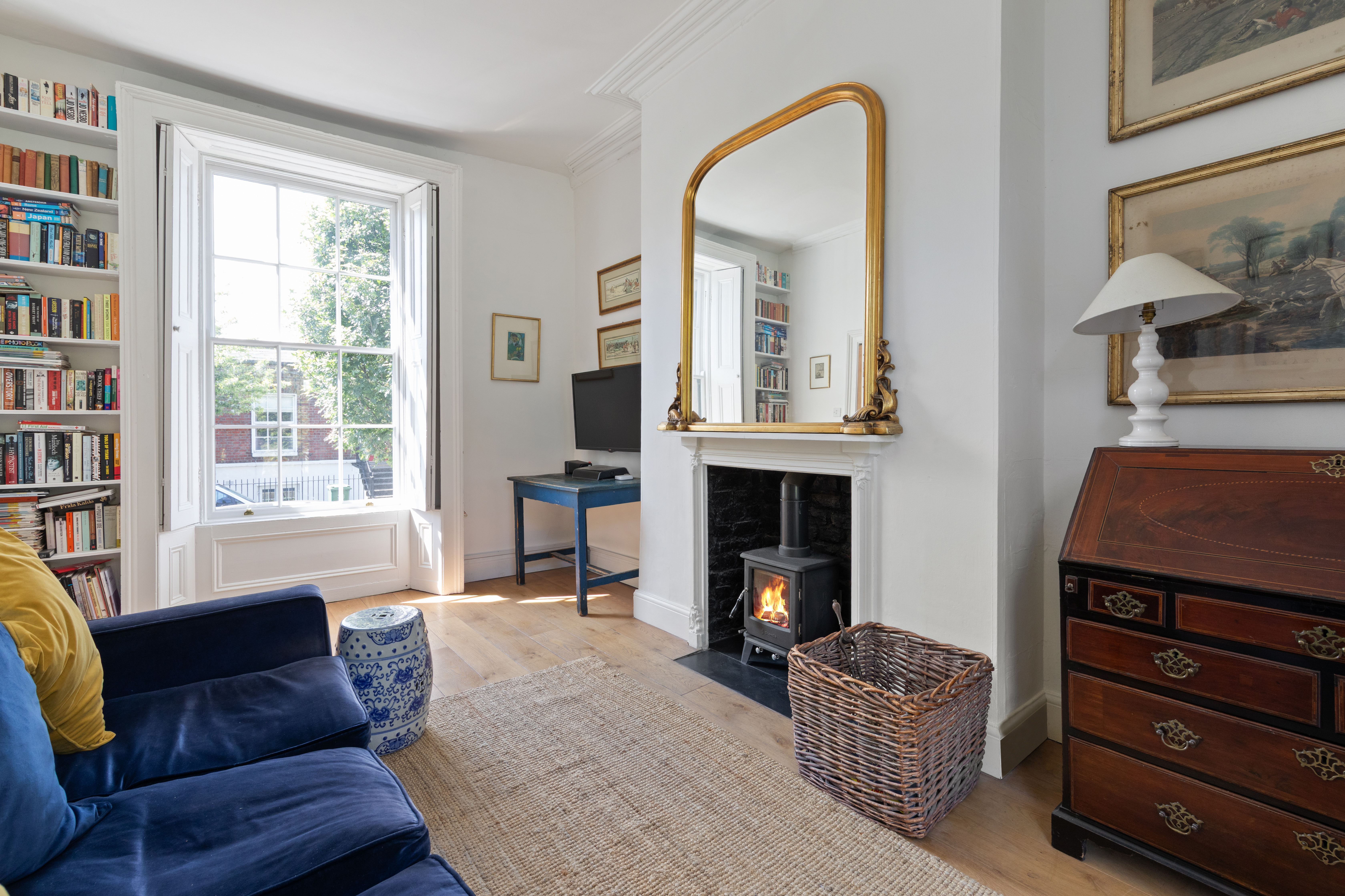 Oak floor, cast iron fire surround, slate hearth, Scandia solid fuel stove, period window boxes with original working wooden shutters, tv point, wooden bookshelves, plaster cornice and ceiling rose.