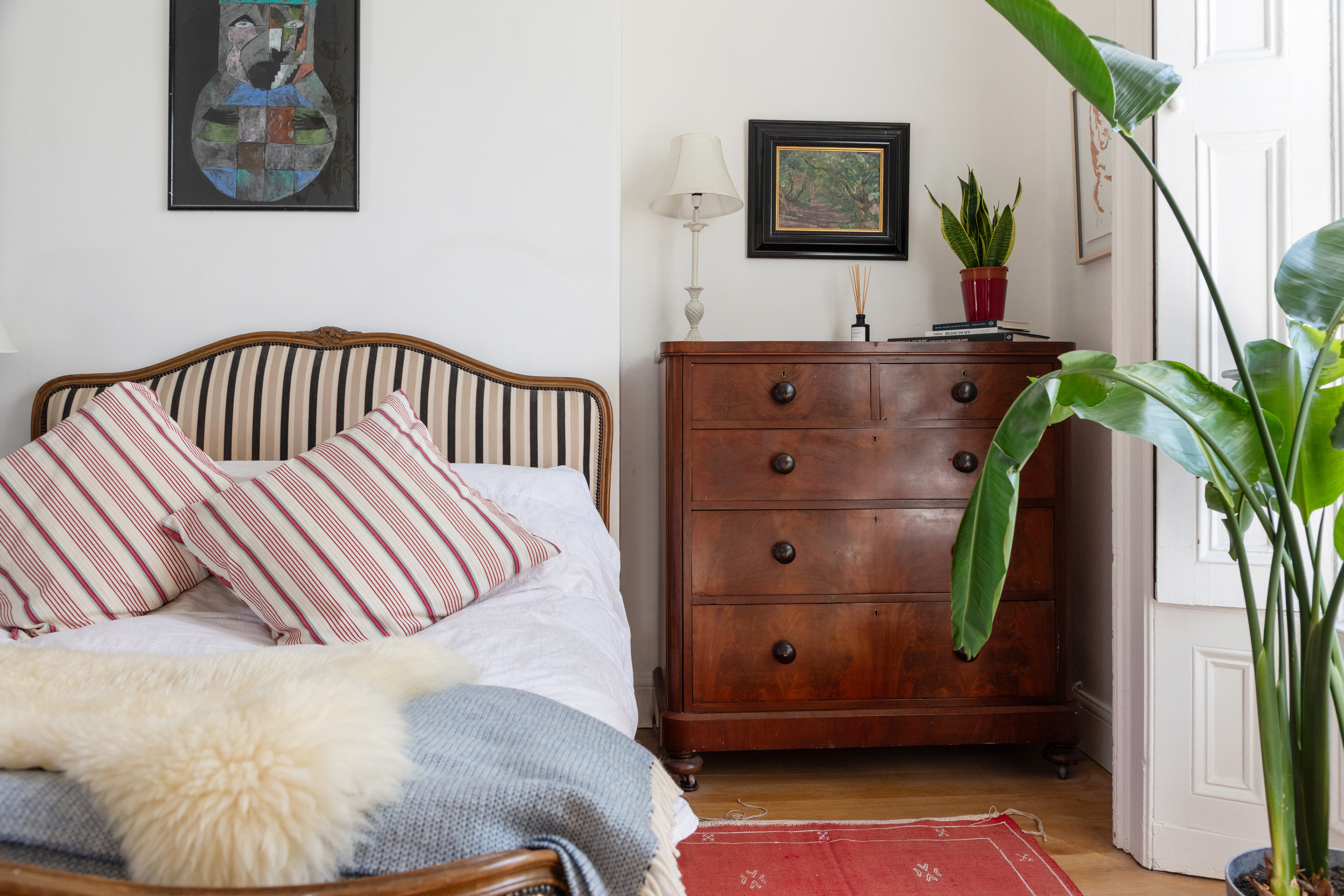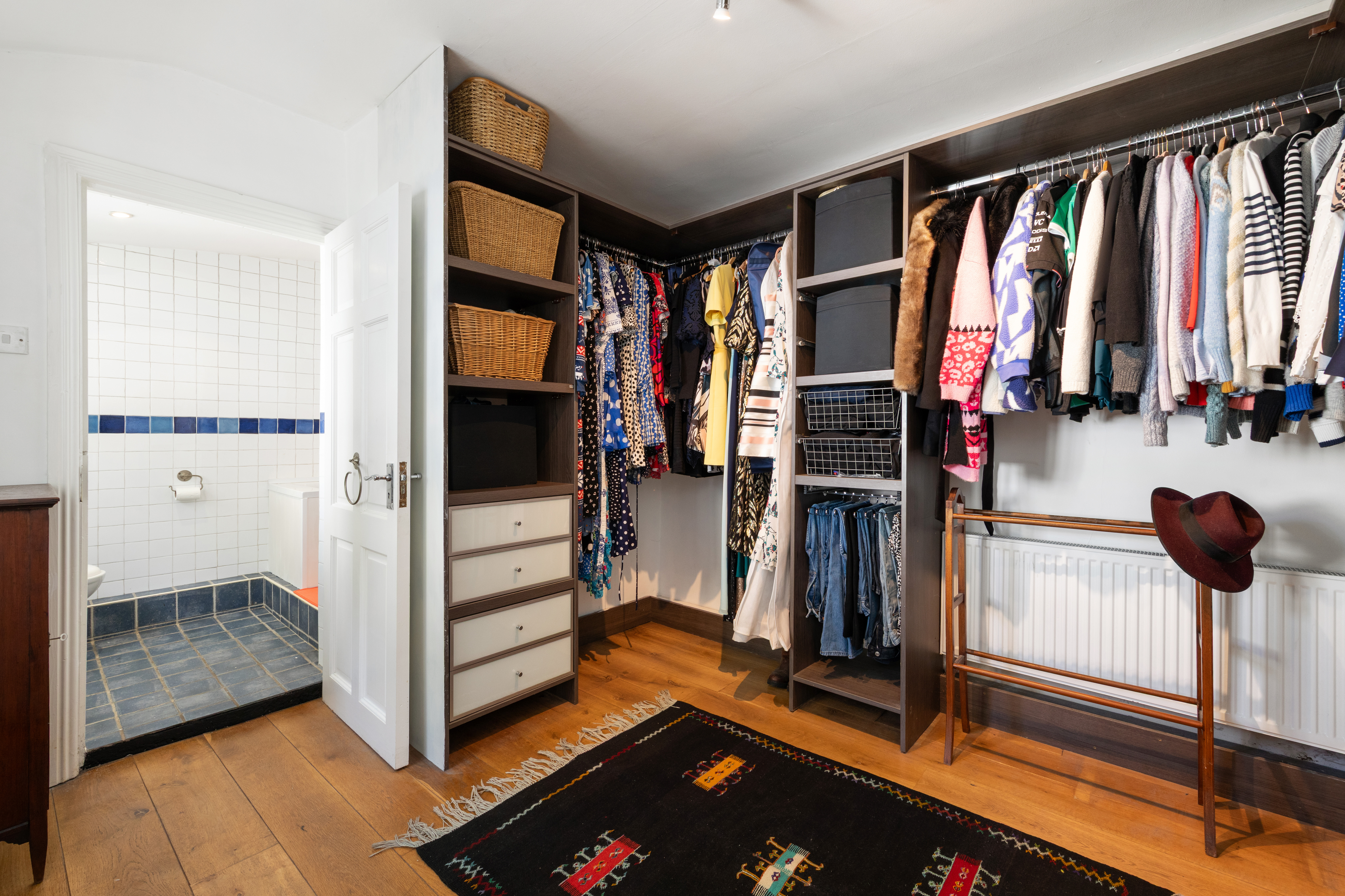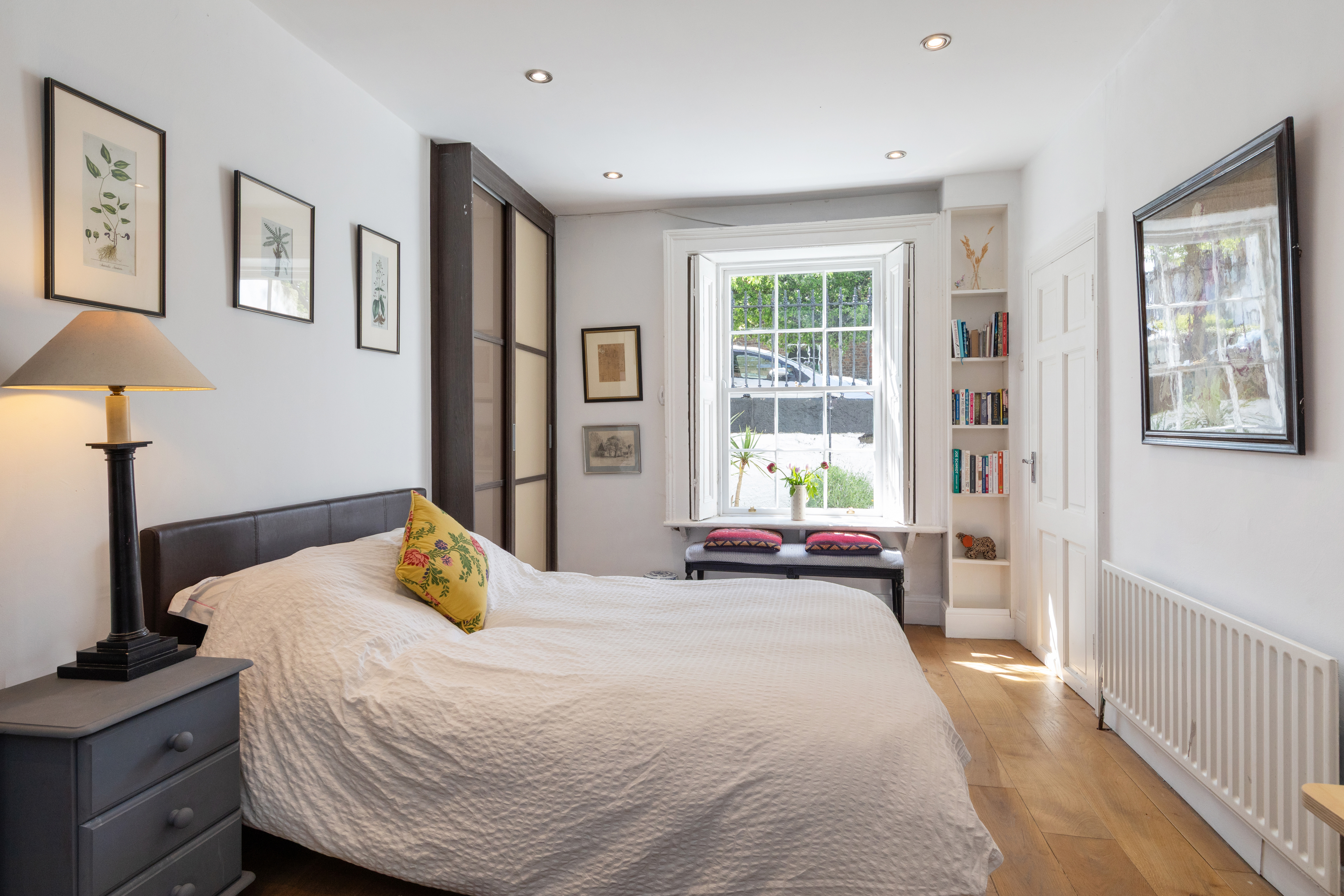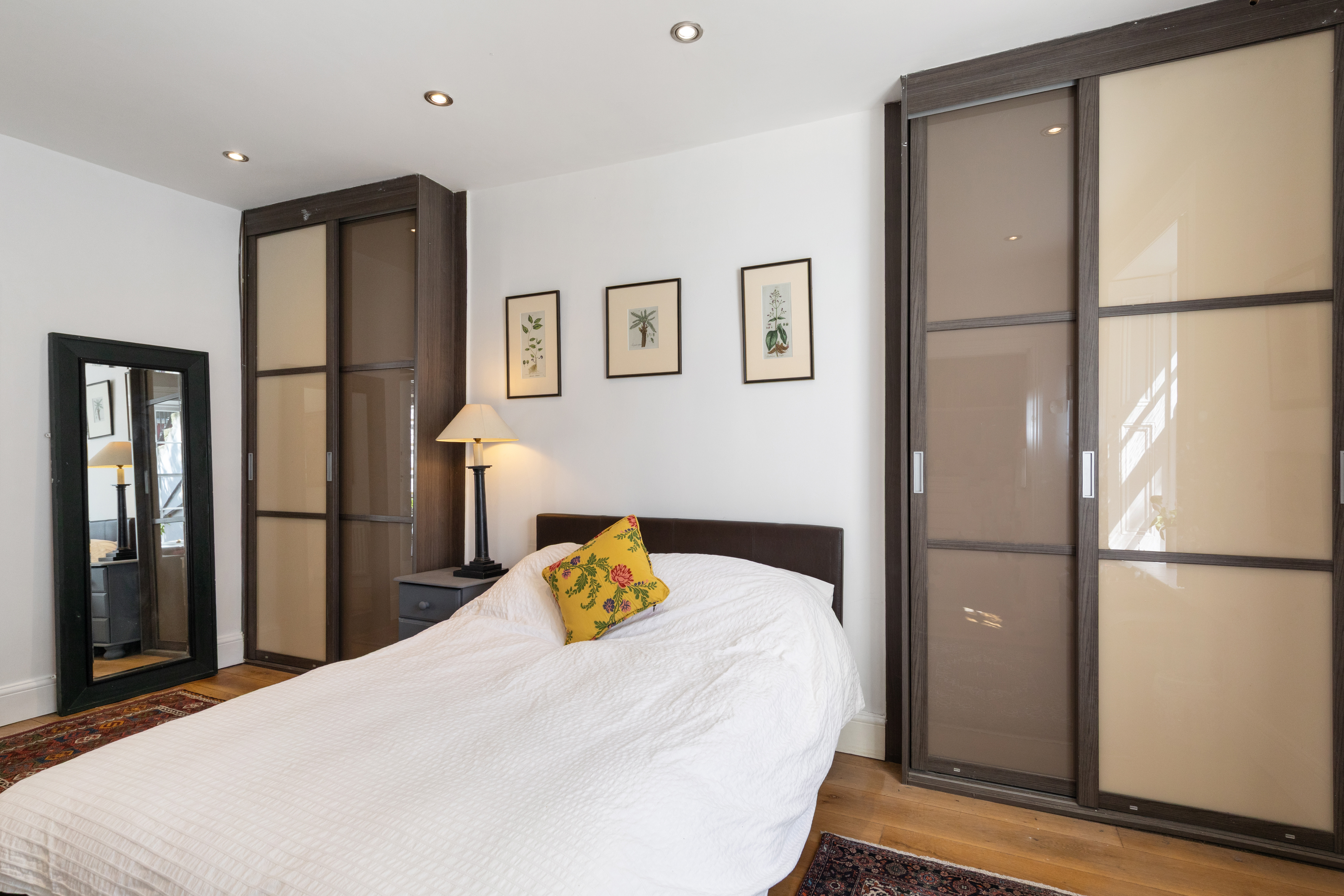 Oak flooring, recessed lighting, window box with original shutter, wooden bookshelves, built in wardrobes.