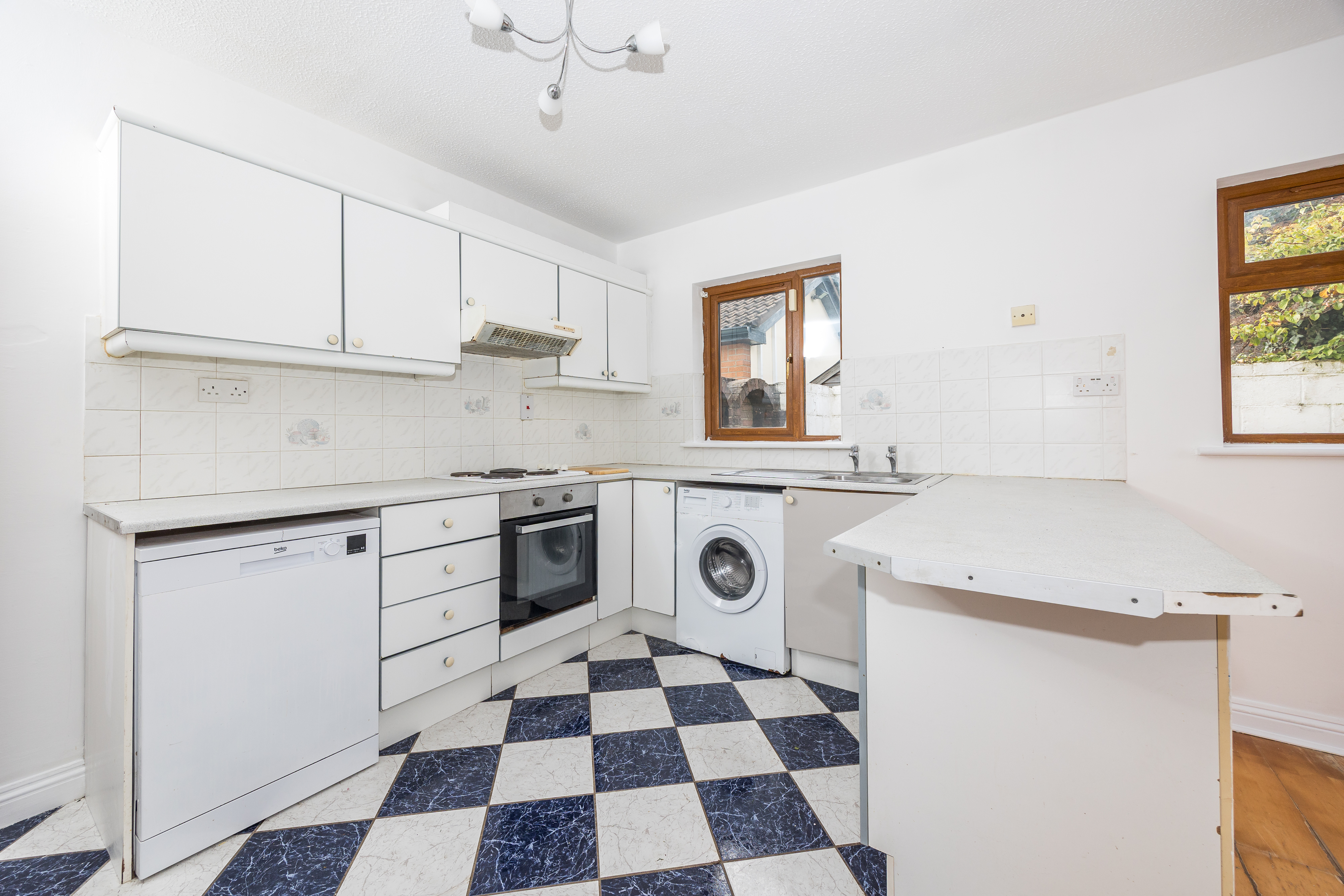 Tiled floor and wooden floor, built in wall and floor units, plumbed for dish washer, plumbed for washing machine, Nordmende oven, Beko four ring electric hob, extractor fan, stainless steel sink and draining board, gas boiler, ceiling lights, French doors to rear garden, curtain pole, heating control.