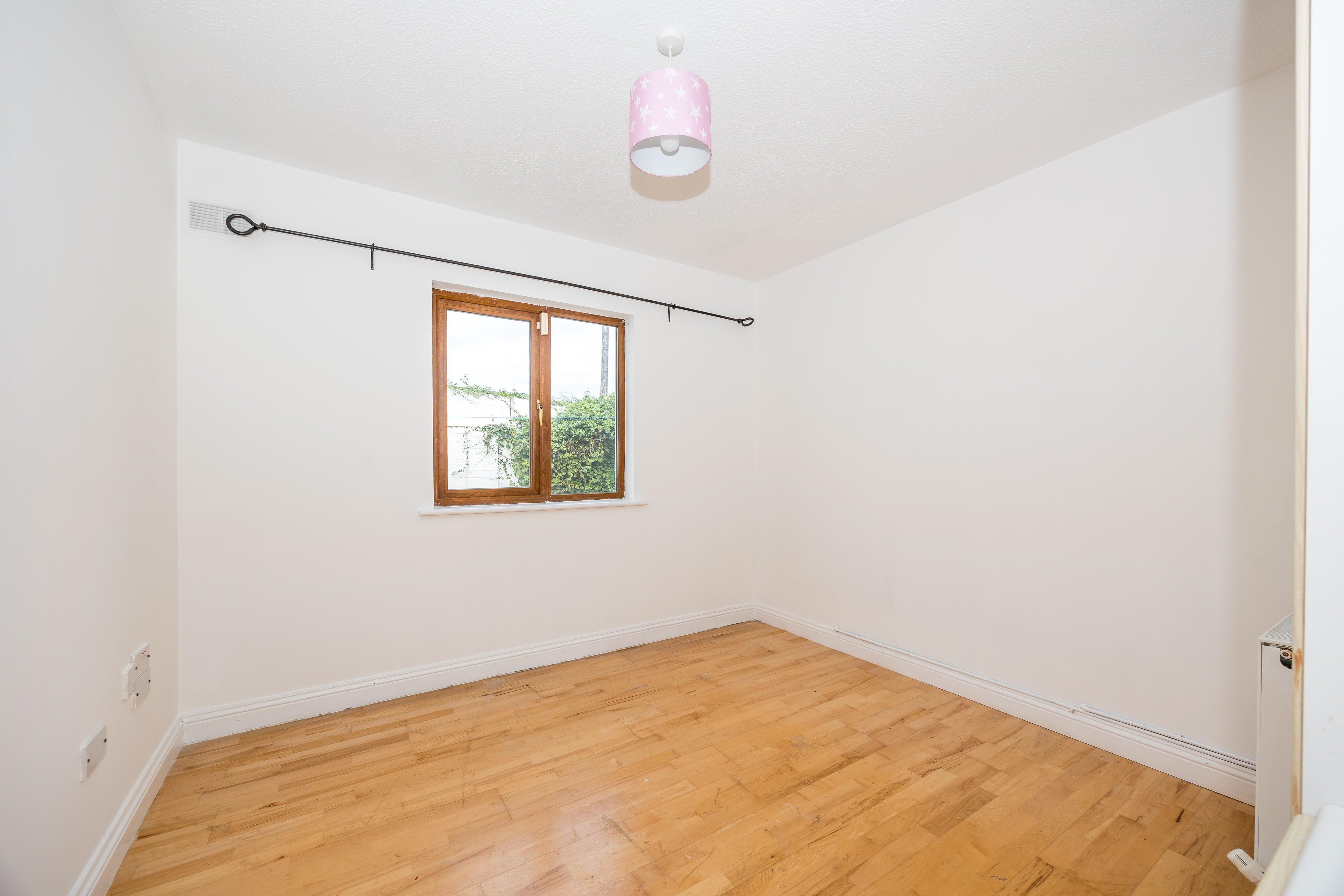 Wooden floor, ceiling light, curtain pole, built in wardrobe.