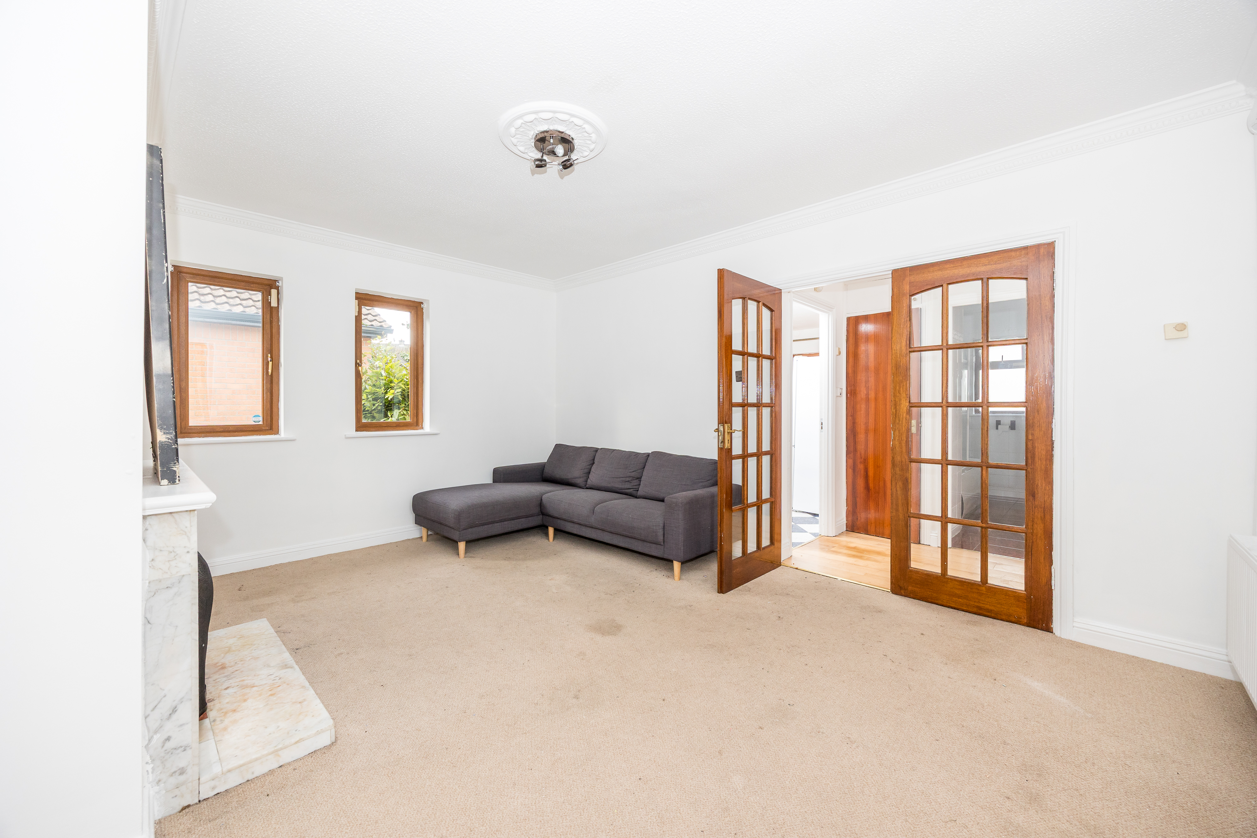 Carpet, marble fire surround & hearth, ceiling light.
