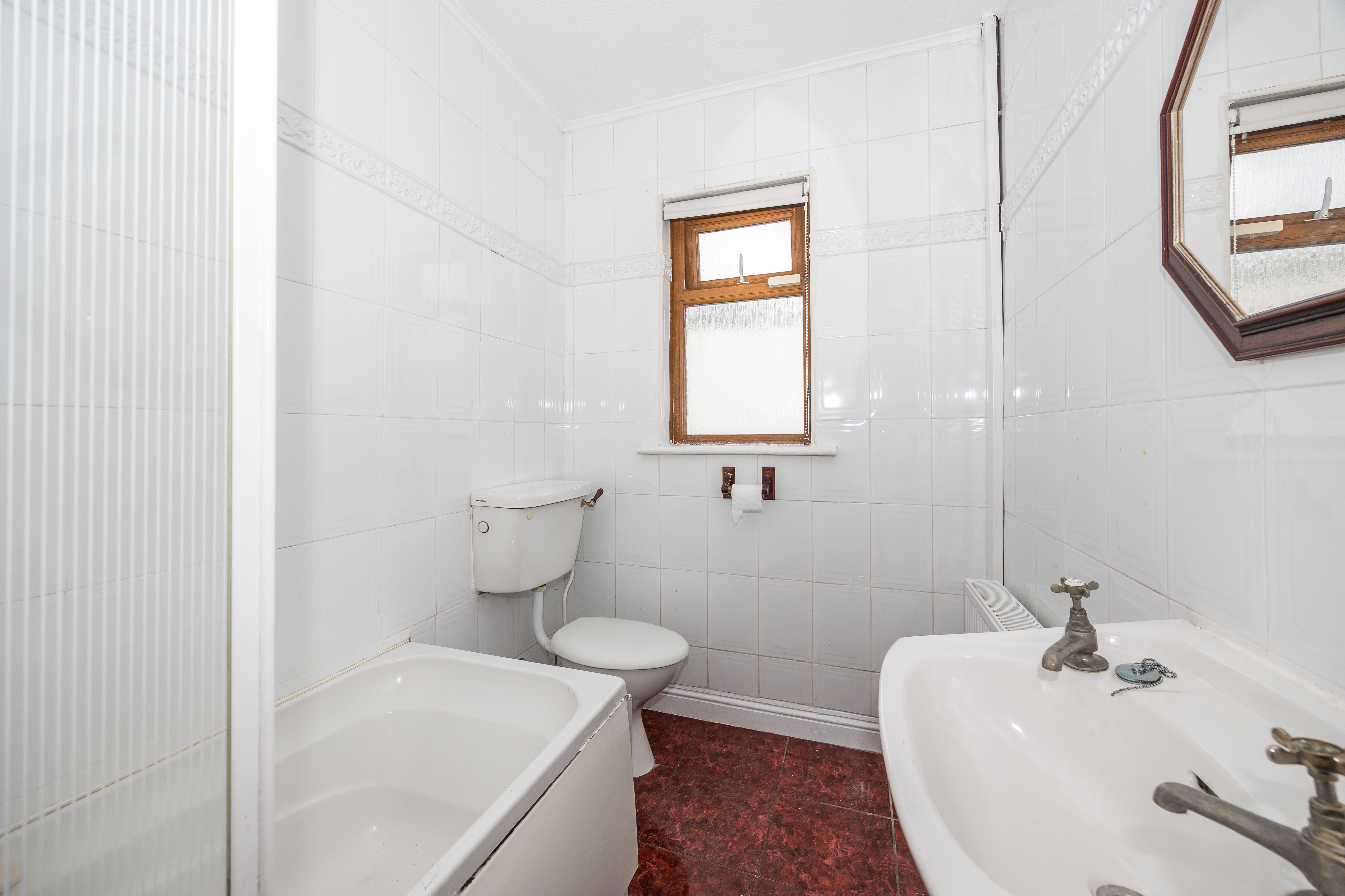 Tiled floor and walls, bath with bath screen, Triton T90Z electric shower, w.c, pedestal sink, wooden shelf, ceiling light, access to attic space.