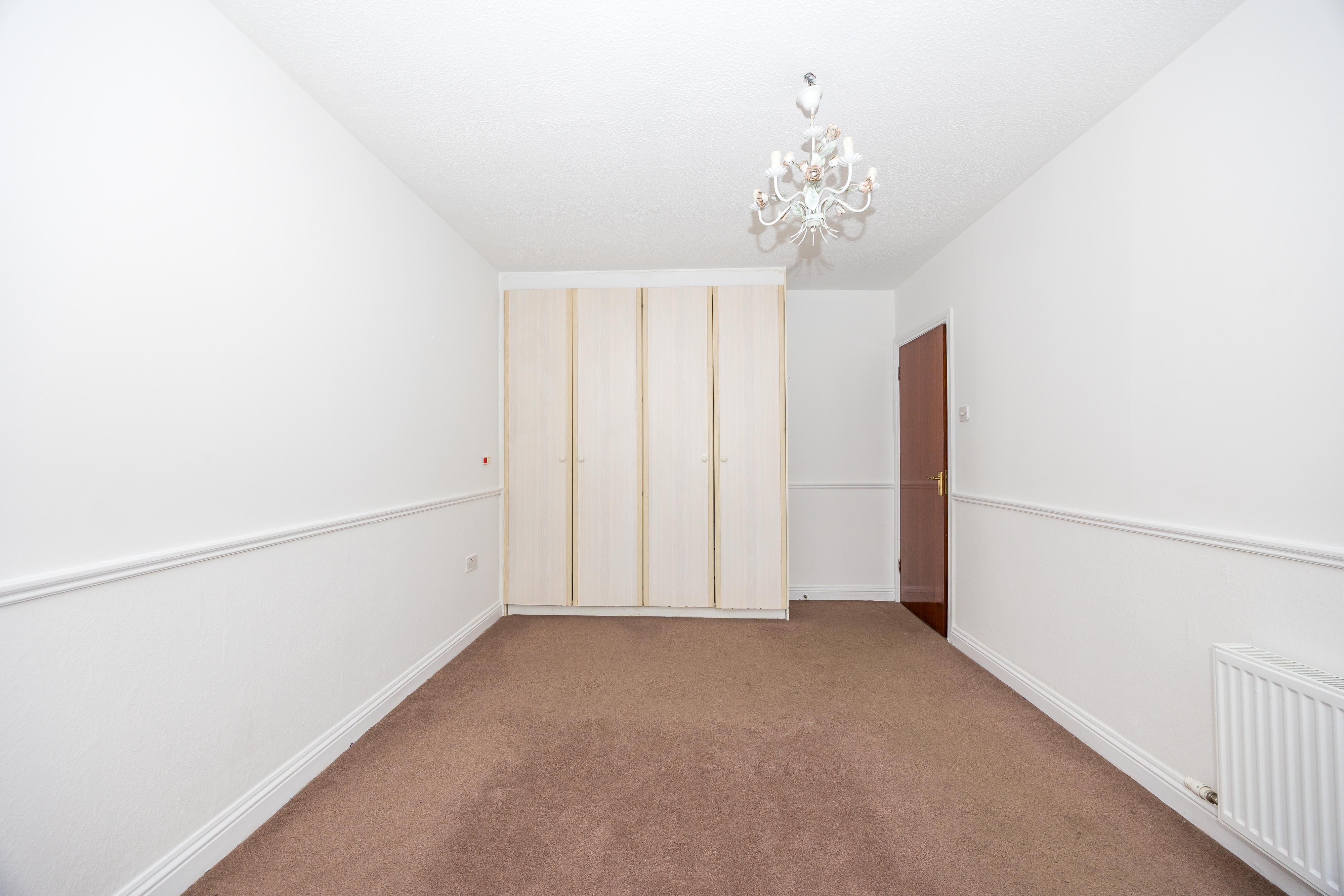 Carpet, large built in wardrobe, ceiling light.